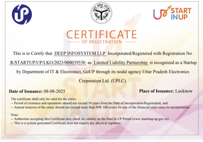 DEEP INFOSYSTEM LLP Earns Prestigious StartinUP Recognition Certification